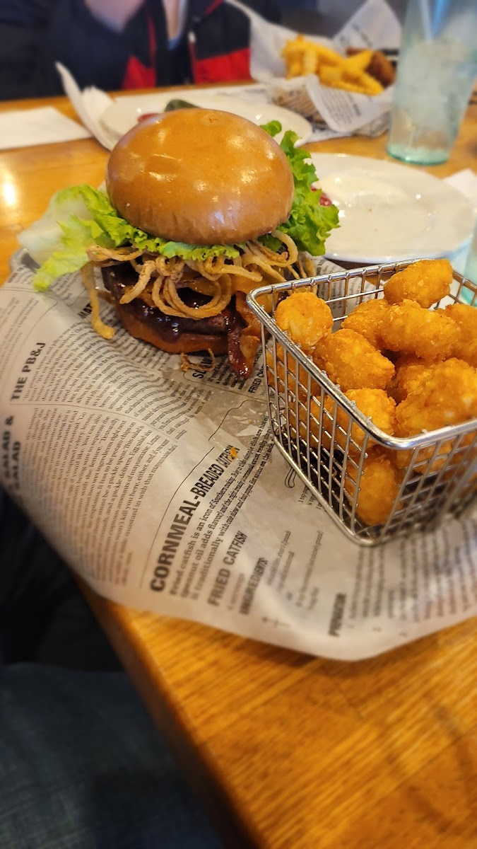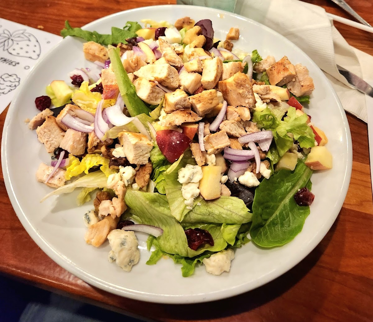 Staff was very accommodating as we were visiting with someone we hadn't seen in almost 10 years. We sat quite a while before ordering. Tator Tot appetizer! They were soooooo good Sorry, forgot the pic. My son had a Charcoal Burger, I was lucky to get a picture because he was really hungry. It was gone quickly I had the Wisconsin Harvest salad with Chicken. I've had it before and for good reason. It's really delicious with cranberries, apples, blue cheese and more. Served with a raspberry vinaigrette...yum! Wait staff even helped us capture the reunion in pictures, so sweet.